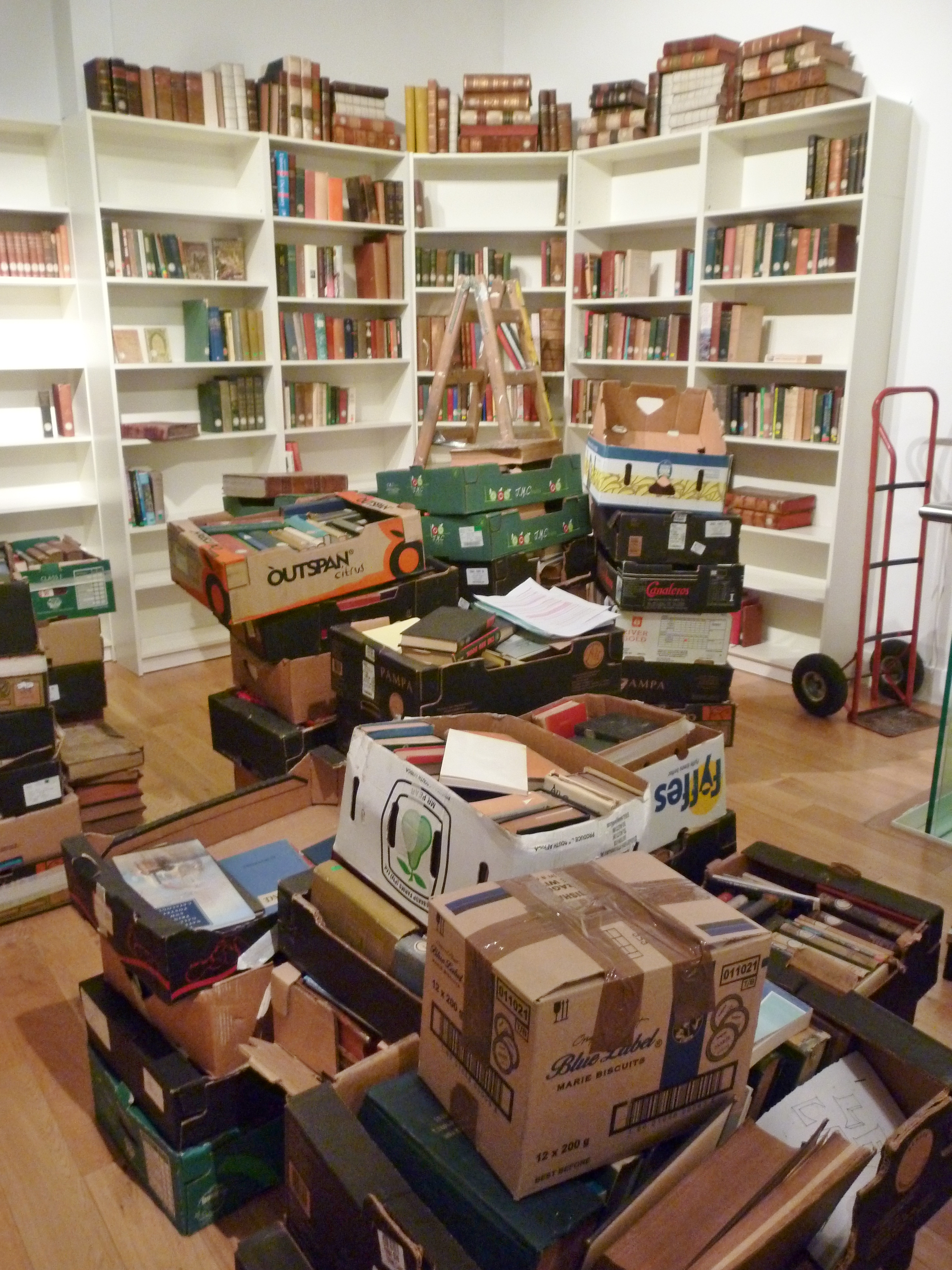 P1040908The Legs Foundation for the Translation of Things (LFTT Library) 21 September – 7 November 2012, The Irish Cement Room Opening, Culture Night, Friday 21 September at 7.00pm In September 2012, The LFTT Library spent six weeks on residence in Highlanes Gallery Drogheda. Highlanes director Aoife Ruane had come across the Library during the summer at The Drogheda Arts Festival (see related posts) and was excited to see how it would work in the historic site of Highlanes Gallery. Also of interest was the parallel relationships of The LFTT Library collection and the Drogheda Municipal Collection which is housed at Highlanes Gallery.